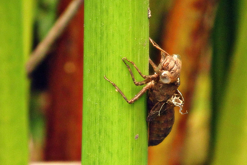 Clinging on to tall vegetation above the pond you can sometimes see evidence of this transformation in the form of dragonfly exuviae. Exuviae are nothing more than the dried outer casing of a young dragonfly. It is what the insect leaves behind when it ends the aquatic stage of its life cycle and turns into the colourful aerial hunter we commonly see. This happens in other species and famously in snakes.